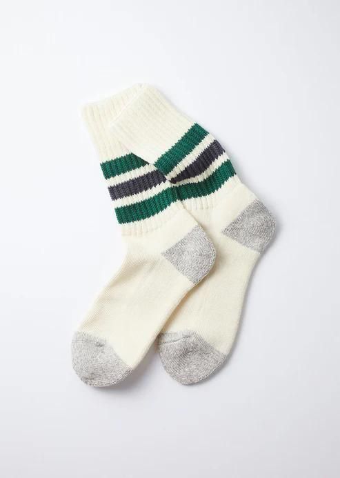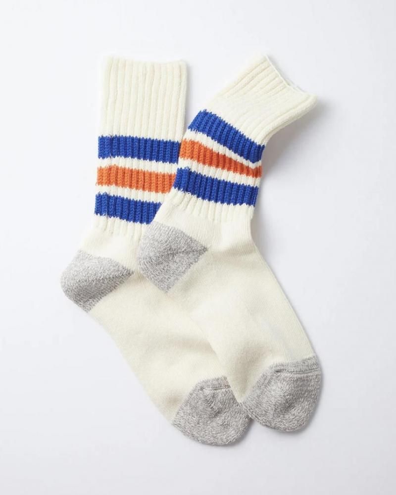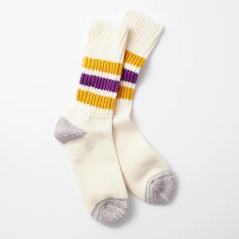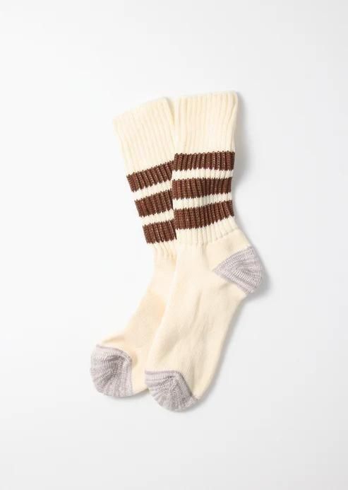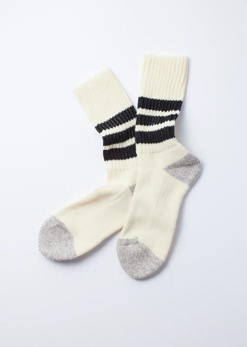 1970年代後半、アメリカ西海岸で流行したレトロチューブソックスをデザインソースに、台数の限られた特殊編み機で編み立てた一足。ハリのある太番手のコットン糸を使い、足底にはロングパイル編みを採用することで、他のブランドにはない弾力性のある履き心地を実現。スケーターのようなスポーティな着こなしからトラッドまで、コーディネートを問わないスタンダードなソックスです。