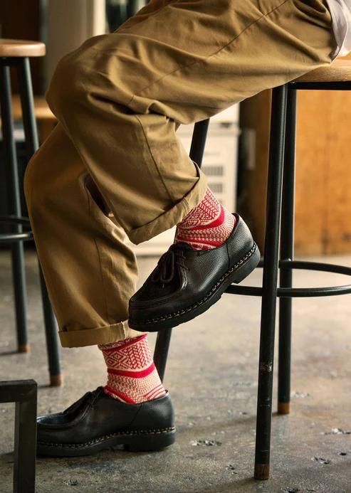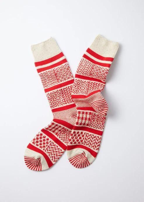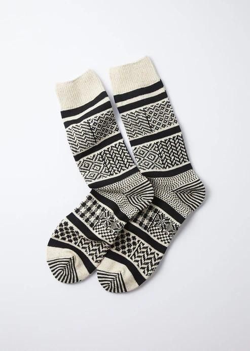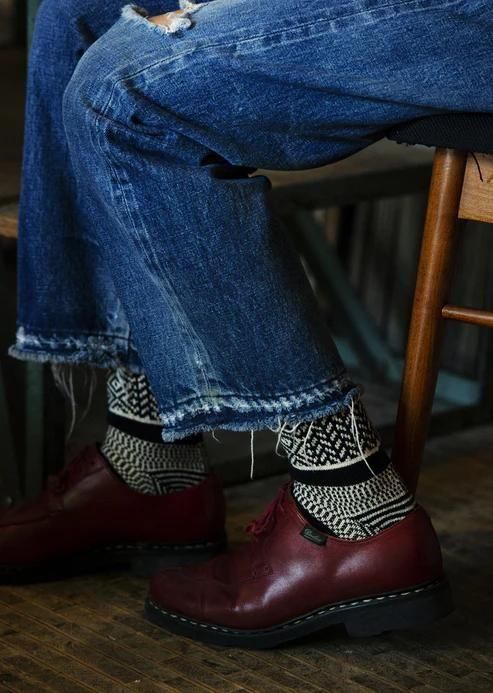 総柄のジャカード編みのソックス。1目1目作成した異なる柄を組み合わせながら編み立てることで、横に伸びづらく、履きにくいといったジャカード編みの課題を解消。また、裏返すと糸端が出てしまう一般的な柄物ソックスとは違い、内側に糸端が出ないよう仕上げることで、履き心地にも徹底的にこだわりました。靴下職人の技術と情熱が詰まった裏返しても美しいソックスです。